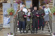 Вокруг храма были вывешены старинные черно-белые фотографии, на которых можно было узнать дорогие всем лица: вот Царь Николай в юности, в военной форме, но уже заметен твердый взгляд, решительность, вот его отец Александр III, родство улавливается не во внешности, а в единстве духа, вот Великие княжны, такие простые, близкие в форме сестер милосердия. Выставка в рамках праздника была подготовлена военным журналистом Андреем Николаевичем Ивановым. Взгляд человека, осматривающего фотографии, невольно падал на место возле храма, где вскоре должен подняться памятник Царской Семье, памятник их великой вере, мужественности, смирению и великой любви к Богу и к своей стране. Пока на этом месте заложен камень, но нашими молитвами и народной помощью памятник будет! Он станет напоминанием о величии России, о великом русском народе, хранителе веры православной.