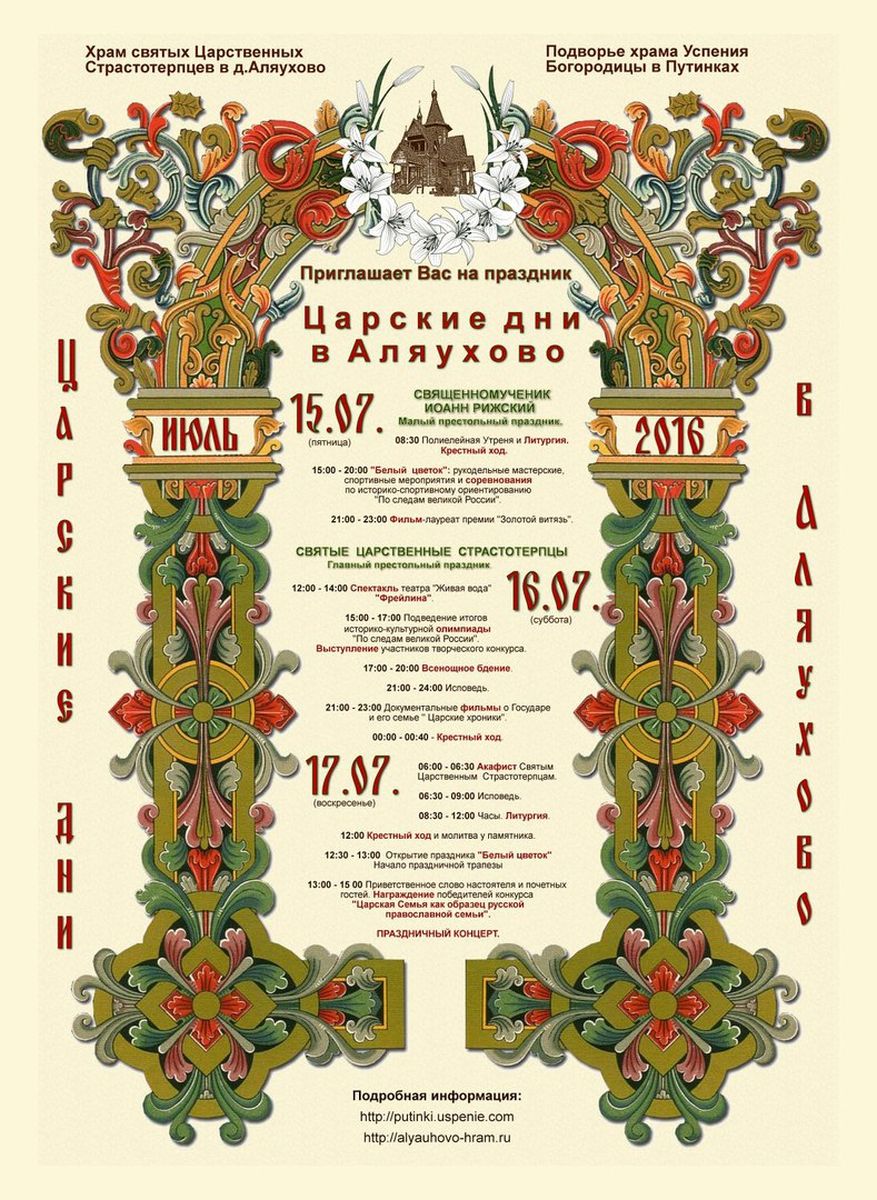 Поздравляем всех тех, кто любит наше Царское подворье в Аляухово, тех, кто не жалеет своих средств и времени на его благоустройство, тех, кто регулярно приезжает на службы и просто потрудиться во славу Божью в храм Святых Царственных страстотерпцев, тех, кто ещё только собирается приехать в наше Царское село Аляухово! Наш проект по развитию Аляухово «Наследники великой России» стал лауреатом III степени на конкурсе Губернатора Московской области. Для нас это очень важная награда! Эта победа важна прежде всего тем, что о нас узнали, услышали и что наше общее дело отметили на уровне губернатора Московской области. А значит, к нашему храму потянутся новые люди, любящие святую царскую семью и нашу великую Россию.