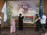 16 июля после завтрака для детей и их родителей состоялась игра-путешествие "Читаем вместе с Царской семьей". Несколько команд путешествовали по разным станциям и выполняли задания, связанные с литературой, которую любили в Царской Семье: они читали стихи, пели песни, вышивали закладки для книг, отгадывали загадки, участвовали в литературной викторине, сочиняли и разыгрывали свои сказки. Победителем игры стала команда «Медведи» во главе с многодетным папой Василием Терентьевым, за что и была награждена памятным похвальным листом. После Игры-путешествия всех гостей ждала выставка картин и концерт победителей нашего ежегодного Царского конкурса, который в этом году проходил под девизом: «Читаем вместе с Царской Семьёй!». Награды победителям конкурса вручала певица Лилия Евсеева, концерт которой прошёл для детей 14 июля, а 15 июля её чудесные песни слышали все гости праздника. Подарки и памятные похвальные грамоты победителей Конкурса получили Ксения Шурухина и Анна Козлова, студия исторического бального танца «Вербочки» под руководством Александра Аношкина и Школа исторического бального танца «Ромашковый вальс» Громовой Натальи Владимировны, певцы Маргарита Аношкина и Вячеслав Баданин, декламатор стихов Ольга Сумина и поэтесса из Сербии Нада Хаджи Перич, все юные артисты звенигородского театра-студии «Серебрянные крылья», художницы Альбина Нестерова, Светлана Кулик и Татьяна Трушина. Памятные знаки храма (миниатюрные копии памятника святым Царственным страстотерпцам) были торжественно вручены певцу народных песен и романсов из Звенигорода Александру Качуре, руководителю театра-студии «Серебряные крылья» Марине Владимировне Титовой (Котельниковой), художнице из Звенигорода Светлане Смирновой, руководителю сербского фольклорного коллектива «Голия» Горану Асовичу и почётной гостье нашего конкурса Лилии Евсеевой, приехавшей к нам из Санкт-Петербурга. Погода в этот день нас не баловала, но концерт прошёл солнечно и радостно. Приехавшие сербы внесли ещё больше радости в наш праздник и несмотря на сильный дождь, после концерта наш русско-сербский крестный ход направился к Поклонному кресту, установленному в прошлом году, в 100-ю годовщину мученического подвига Царской семьи, при въезде в Аляухово